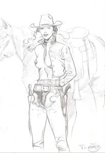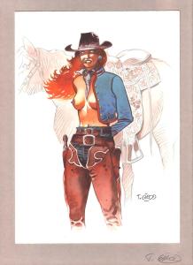Illustration originale Cow girl par Thierry Girod. Technique mixte : Crayon, encre de Chine, aquarelle, gouache. Signée.