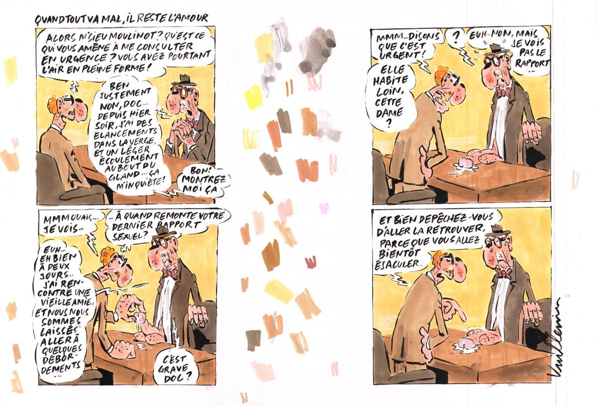 Gag original complet de Philippe VUILLEMIN : Quand tout va mal il reste l'amour. Mise en couleur vendue avec l'original en noir et blanc à l'encre de Chine