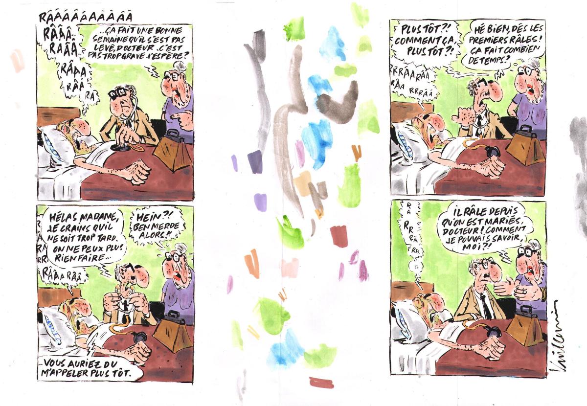 Planche originale de Philippe Vuillemin publiée chez Charlie Hebdo. Mise en couleur à l'aquarelle vendue avec dessin original sur calque. Aquarelle et encre de Chine.